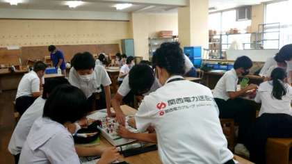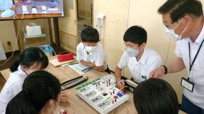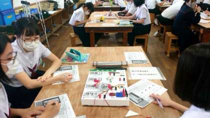 グループ毎に実験教具が配られました。手回し発電で電気を起こす実験です。風車が回ったり明かりが灯ったり、面白い体験です。