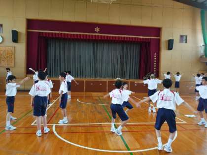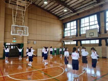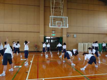 体育館で1年生体育の授業が行われています。今日はラジオ体操のテストがあります。皆さん輪になってテスト前の練習に励んでいます。懸命に頑張っている姿がステキです。
