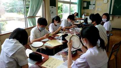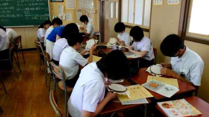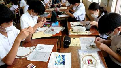 2年生家庭科でクロスステッチの実習中。それぞれが考えたデザインが決まり、色とりどりの刺繍糸を使って制作します。美しい作品になりますように!