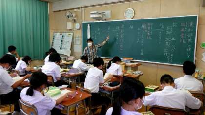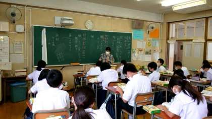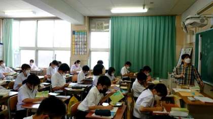 1年生国語科で漢和辞典のひき方を学習中。皆さんの机上に漢和辞典が用意され、先生の説明にあわせて実際に調べてみます。部首索引や音訓索引など、いろんな調べ方がありますね。