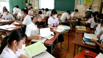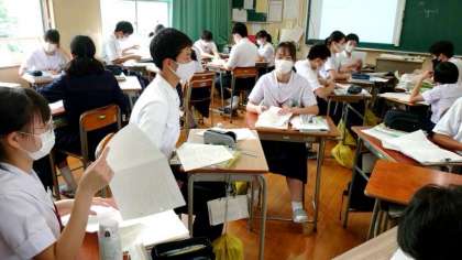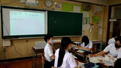 3年生数学の授業でグループ学習を行っています。平方根の計算問題について、お互いに教え合うとのこと。互いに疑問点を出し合って、課題解決を進めましょう。