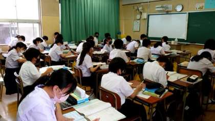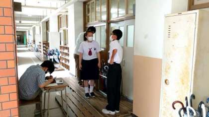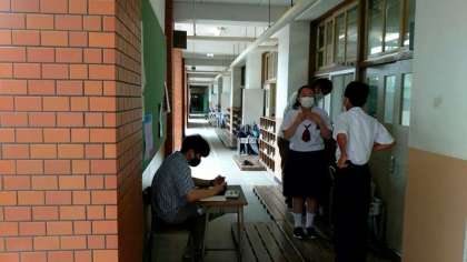 1年生英語科で英会話のテスト中。2人ずつ廊下に出て会話を交わし、C-NETのミック先生に評価していただきます。皆さん身振り手振りを交えたやりとりが良いですね。