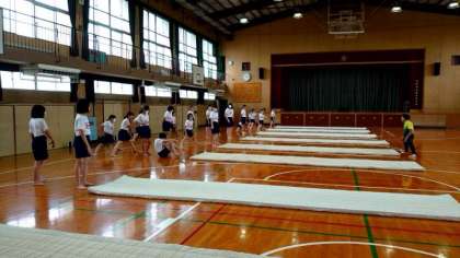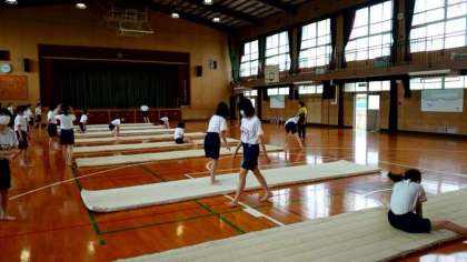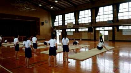 2年生女子体育でマット運動を練習中。前転や後転など、いろんな技に挑戦します。皆さん身体のバランスを意識して、上手に回転しています。