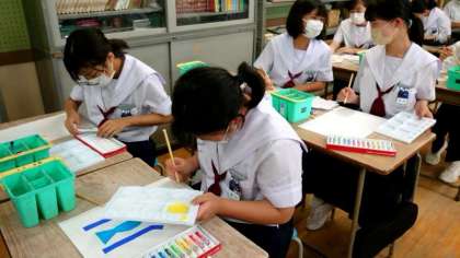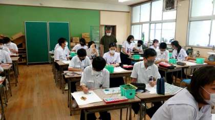 1年生美術科で、レタリングと絵文字の作品を制作します。自分の名前を明朝体で美しく仕上げます。絵文字では、部首の一部を動物やモノに変えて、オリジナルの文字を創作します。ユニークな作品ができると面白いですね。