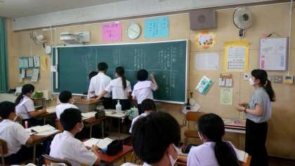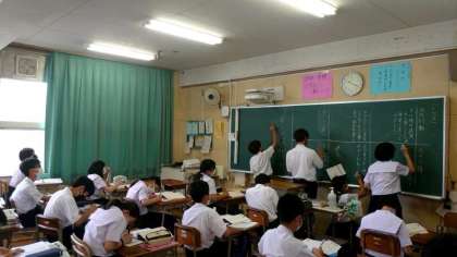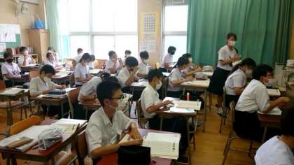 1年生国語科で物語を鑑賞中。読んでいる作品は向田邦子さんの「字のない葉書」。中学の教科書では定番の名作。皆さん登場人物の気持ちになって、心情の変化を黒板に書き留めます。それぞれの考えを共有しながら学習を進めましょう。