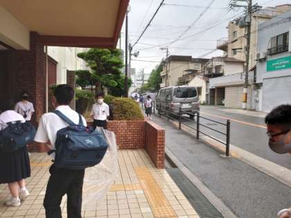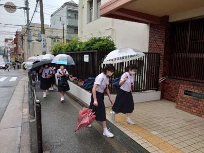細かな雨が路面を濡らす朝。正門玄関がカラフルな傘で彩られています。明日から期末テストが始まります。明日は社会・数学・美術の3教科。体調を万全にテストに臨みましょう。