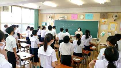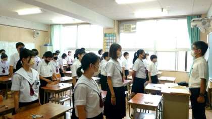 開始5分前の予鈴が鳴りました。1年生の皆さんが監督の先生と朝のあいさつを交わします。これから始まる50分間のテストに集中しましょう。