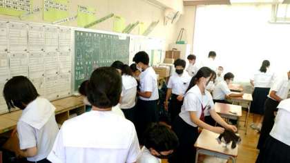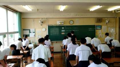 まもなく1時間目理科のテストが始まります。2年生の教室では問題用紙が配られるのを静かに待っています。勉強した内容が1問でも多く出題されていますように!