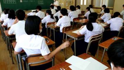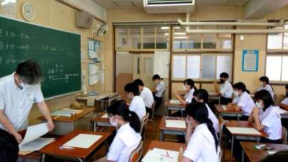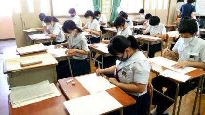 まもなく英語のテストが始まります。2年生の教室では開始のチャイムを待つばかり。長文読解や英作文、リスニングなど内容盛りだくさん。時間配分を意識して解いてくださいね。