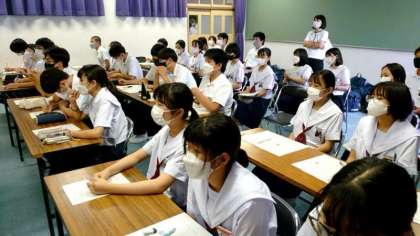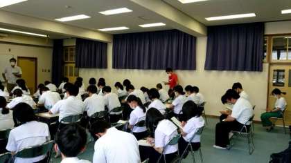 期末テストが終わり、部活動の代表・各クラスの保健委員さんが「熱中症予防講習会」の受講に集まっています。クラブ活動やふだんの学校生活で、熱中症にならないよう、留意点を教わります。