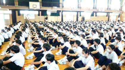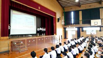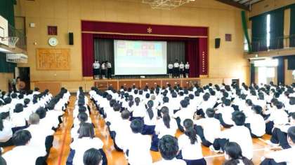 全校集会で生徒会の皆さんがSDGsの取り組みを報告しました。高校と連携した古着リサイクルやプラスチック製品の回収など、幅広く活動しています。