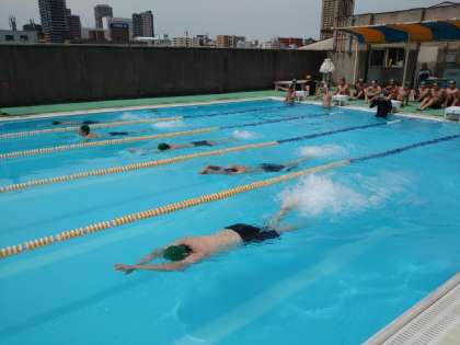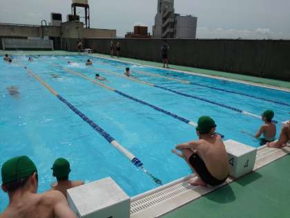 今日から体育の授業で水泳が始まりました。今週は男子の皆さんがプールに入ります。気温も高く、水の中が気持ち良さそう。皆さん楽しく泳いでいます。