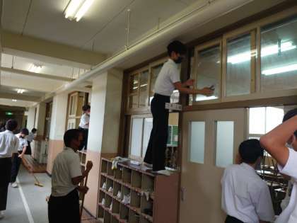 2年生の皆さんも大清掃に取り組みます。高い所のガラス窓や換気扇など、日々の清掃ではやらない箇所を重点的にお掃除します。1ヶ月で結構ホコリが付いていますね。