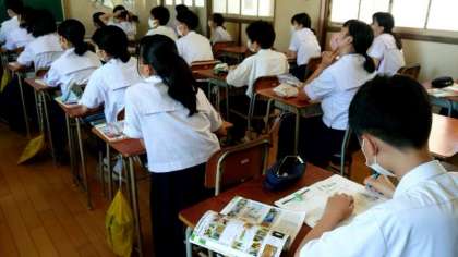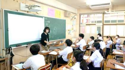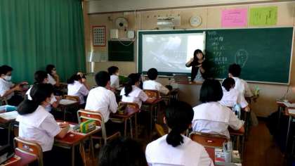 1年生理科の授業で無セキツイ動物を学習します。スクリーンには節足動物の仲間「ゲジゲジ」が映っています。和名では「ゲジ」と呼ぶそうです。見た目は怖そうですが、ゴキブリなどの害虫を食べてくれる益虫です。