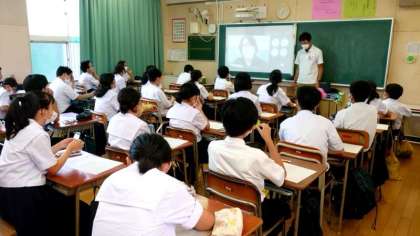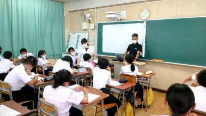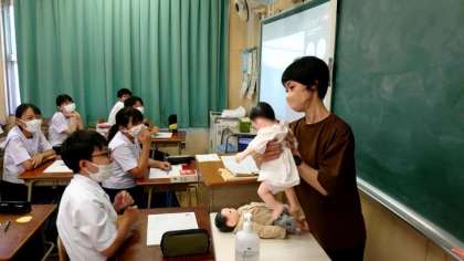 1年生の各教室で「命の尊さ」についてオンラインで学習中。助産師さんを講師に迎えて、リモートでお話を伺います。赤ん坊の人形も持ってきてくださいました。後から体験コーナーもあるようです。