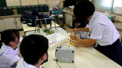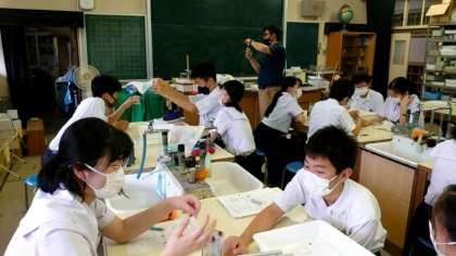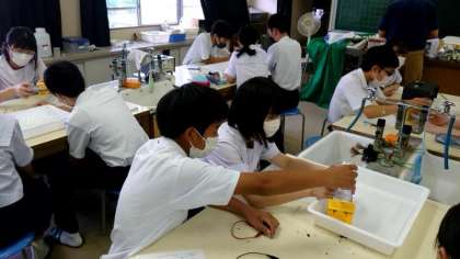 2年生の皆さんが理科室に集まっています。これから「水酸化ナトリウムの電気分解」を実験します。電流を流すと、水素と酸素が発生するとのこと。皆さん上手くいきましたか?