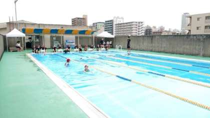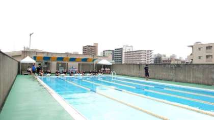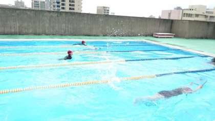 校舎屋上にあるプールでは水泳の授業が行われています。今週は女子がプールに入ります。曇っているものの、水が気持ち良さそうです。皆さんのびのびと泳いでいます。