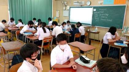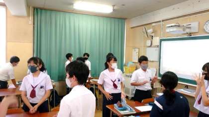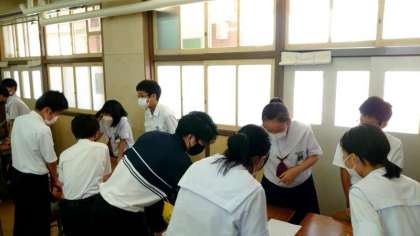 1年生英語の授業でロールプレイングに取り組みます。「この夏はどう過ごしますか?」をテーマにグループで英会話のお話を考えます。皆さん、身振り手振りを交えながら、登場人物になりきって楽しく演じています。