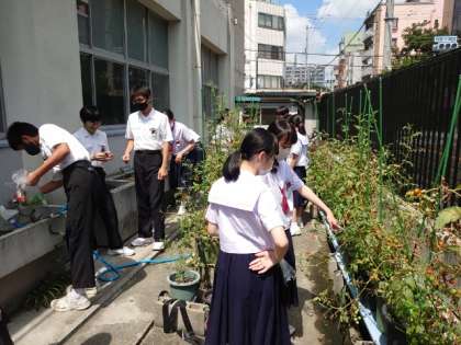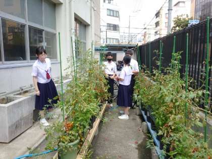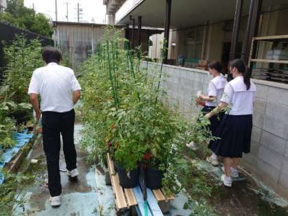 2年生技術科で栽培しているミニトマト。今日はみんなで収穫します。それぞれビニール袋を手に、真っ赤に実ったミニトマトを詰めこみます。あわせて育てたバジルも採りました。バジルの香りが部屋いっぱいに広がっています。