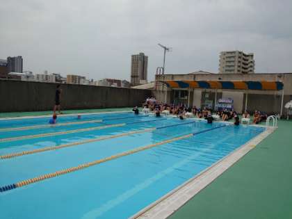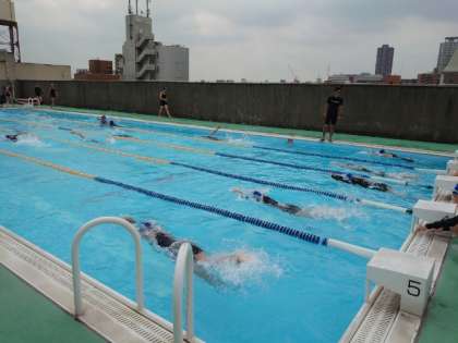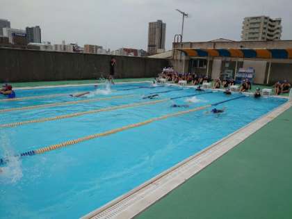 校舎屋上のプールでは1年生女子の皆さんが気持ち良さそうに泳いでいます。強い陽射しが無いのも暑すぎず良いですね。1年生の皆さんはコロナ禍の影響を受けて、水泳の授業は久しぶりとのこと。楽しんで泳いでくださいね。