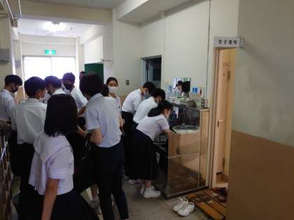 校舎2階では2年生の皆さんが頑張っています。教室のエアコンフィルターや扇風機のファンを取り外し、キレイに洗います。暑い時に活躍してくれたのでピカピカにしてあげてくださいね。