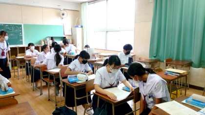 夏休みに入りました。各教室では学習会を行っています。1年生英語科は英検の対策講座を開催中。英検取得をめざす1年生が集まり過去問などにチャレンジします。同じ目標を持つ仲間がいると心強いですね。