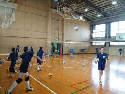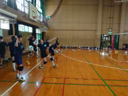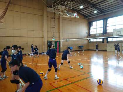 女子バレーボール部の皆さんがサーブを練習しています。体幹を意識して打たないと、腕の力だけではなかなか上手く打てません。繰り返し試行錯誤しながらコツをつかんでくださいね。
