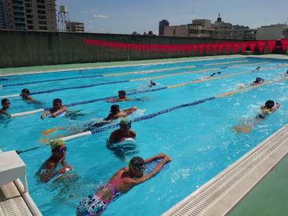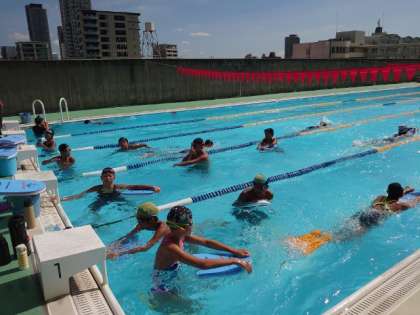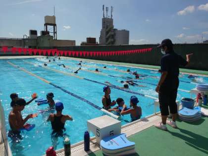 校舎屋上のプールでは、水泳部の皆さんがウォーミングアップ中。まずは自身のフォームを確かめながら、ゆったりと泳ぎます。真夏を陽射しが降り注ぐ中、皆さん気持ち良く泳いでいます。