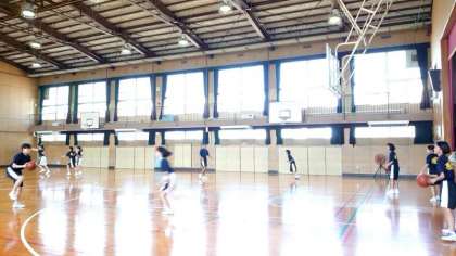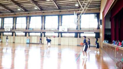 体育館では、男子に続いて女子バスケットボールの皆さんが活動しています。現在3ポイントシュートの練習中。スリーポイントラインの外からシュートしますがリングまでの距離(6.75m)があるので、なかなか上手く打てません。繰り返し練習してコツをつかみましょう。