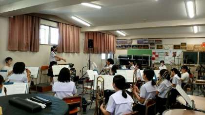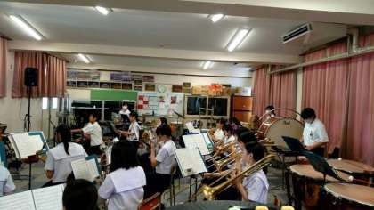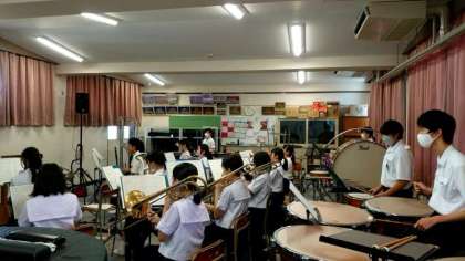 各パートに分かれて練習していた吹奏楽部の皆さんが音楽室に集まってきました。来週の吹奏楽コンクール府大会で演奏する楽曲を奏でます。地区大会での演奏内容をよりブラッシュアップして本番に臨みたいですね。