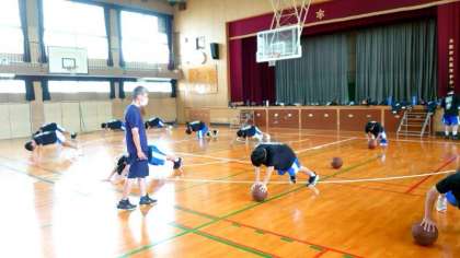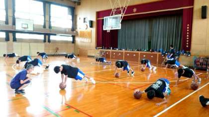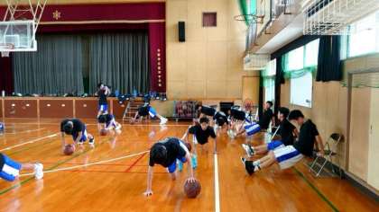 お盆休みが明け、校内に元気な声が戻ってきました。体育館では男子バスケットボール部の皆さんが基礎トレーニングの真っ最中。ボールを使った筋トレはキツそうですが、皆さん頑張っています。