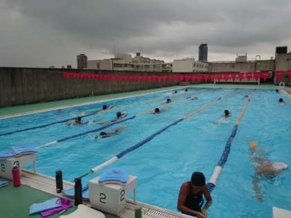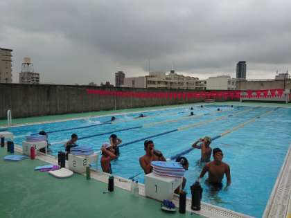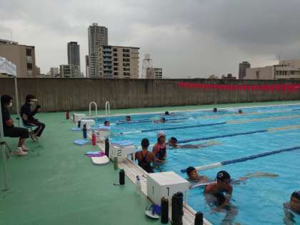 校舎屋上のプールでは水泳部の皆さんが気持ち良く泳いでいます。今朝は曇り空なので、昨日までの猛烈な暑さは感じませんが、水温は30度あるとのこと。給水を忘れずに練習してくださいね。