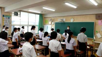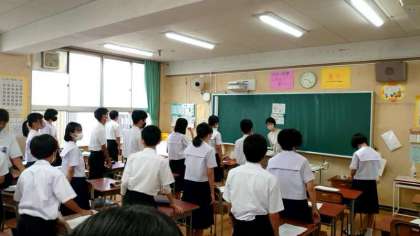 集会が終わり、各教室でホームルームが行われています。1年生では朝のあいさつが交わされています。皆さん元気に夏休みを過ごしているようで何よりです。