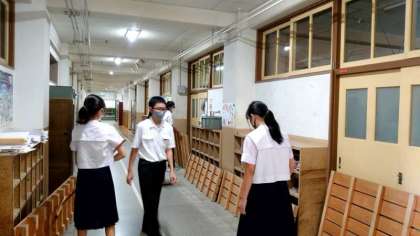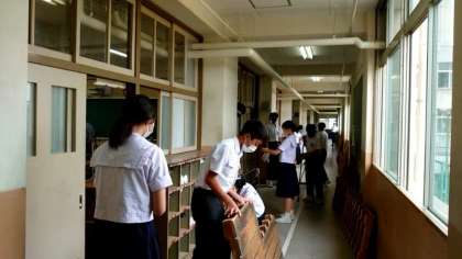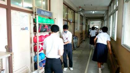 2階では2年生の皆さんが清掃活動中。職員室や特別教室前の廊下も2年生の分担。校内で皆さんが一番多く通る場所。スノコを上げて細かなホコリもお掃除してくれています。