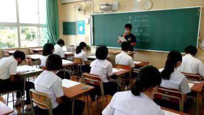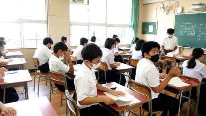2年生の教室ではテスト問題が配られています。先生からテストの諸注意を聞きながら、開始のチャイムを待っています。一気にピンと張りつめた空気が教室を包みます。皆さんの真剣さの表れですね。