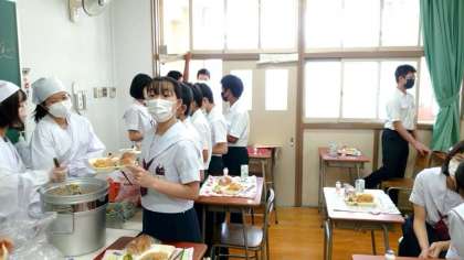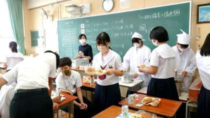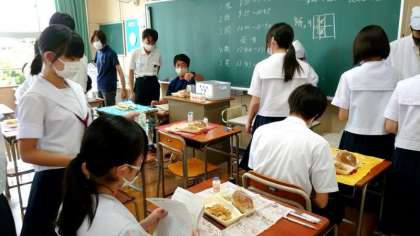午前中のテストが終わり、これからお昼ごはんをいただきます。久しぶりにみんなでいただく給食。本日の献立は「焼きそば・キュウリのピリ辛あえ」。2年生の教室では係の皆さんが配食中。たくさんいただいてくださいね。