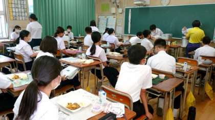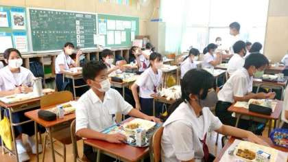 お昼休みのチャイムが鳴り、お待ちかねの給食です。今日の献立はビーフカレー。人気メニューで食事も進みそう。今週から平常通りの授業が行われています。1年生の皆さん、午後の教科も頑張りましょう。