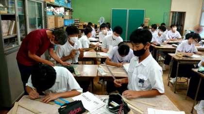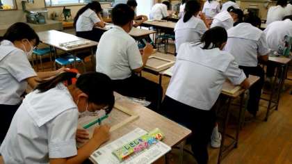 1年生美術の授業で「色紙を飾る額」を制作中。まずは額のデザインを考えます。直線や曲線を上手に組み合わせ、さまざまな模様を描き出します。デザインが決まれば、彫刻刀で彫りすすめます。ケガに気をつけてくださいね。