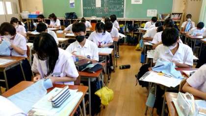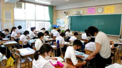 1年生家庭科で「刺し子」刺繍の実習中。水色の布地に薄くプリントされた線に沿って刺繍糸を縫い付けます。七宝つなぎ・矢羽根・花刺しなどの伝統的な図案があるそうです。皆さんはどの図案にチャレンジしますか?