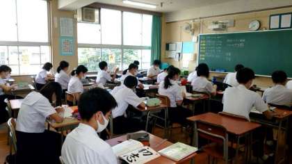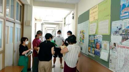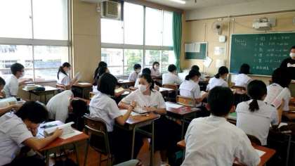 テスト開始前の廊下で3年生の先生方が打ち合わせ中。テストが円滑に実施できるよう、留意点を互いに確認します。教室では生徒の皆さんが最後の追い込みに余念がありません。