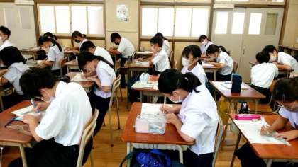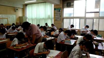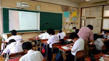1年生技術科で製図の実習中。キャビネット図や等角図は、物の形を立体的に表すために用いられるそうです。先生から作図手順を教わった後、実際に作図にチャレンジ。わからない点は質問しましょう。