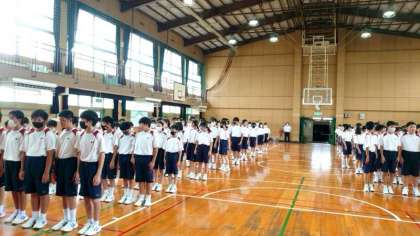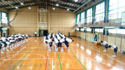 現在1年生の学年練習が行われています。全員が隊列を整えて集団演技に取り組みます。みんなと息を合わせるのが難しい演技ですが、繰り返し練習してくださいね。