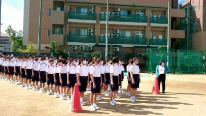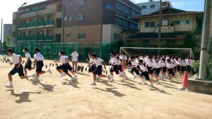 快晴の朝。運動場では1年生の皆さんが体育大会学年演技に取り組んでいます。現在、演技冒頭の「入場〜整列」の動きを練習中。運動場に記された目印を見て自分の立ち位置を確かめてくださいね。