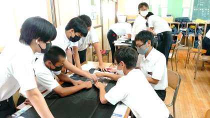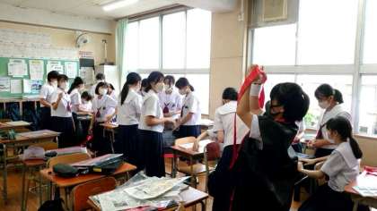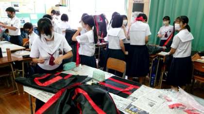 2年生各教室で体育大会の学年演技「南中ソーラン」で着る衣装のペインティング中。ステンシルの技法を駆使して漆黒の法被に「高津」の文字を染め上げます。カッコいい衣装を身にまとい踊る姿を楽しみにしています。