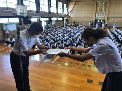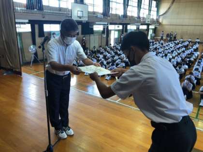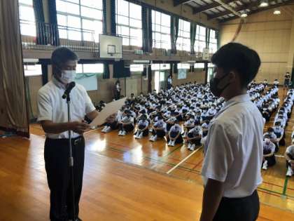 今朝の全国集会で部活動表彰を行いました。陸上部・水泳部の皆さんが市大会やブロック大会で見事入賞しました。練習の成果が実って良かったです。多くの温かい拍手が嬉しいですね。