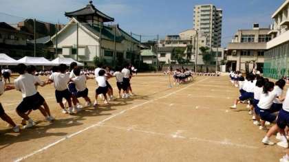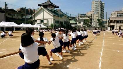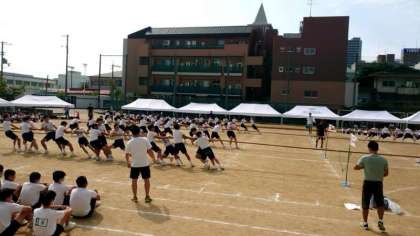 集団競技の練習が始まりました。全学年がクラスを縦割りにして、綱引きで競いあいます。1組から4組まで、どのクラス集団が優勝するでしょう?