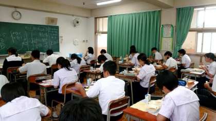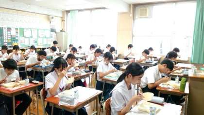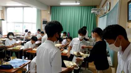 お昼のチャイムが鳴り、お昼ごはんの時間です。今日はプルコギ・モヤシの甘酢あえ・トックの韓国料理をいただきます。プルコギの甘辛いお味にご飯がすすみます。2年生の教室では完食が続出。皆さんたくさんいただきましょう。
