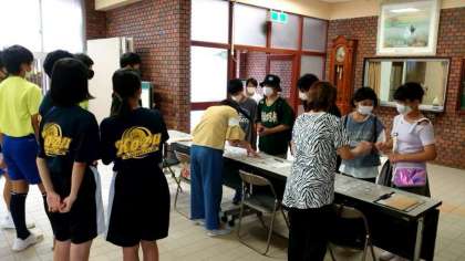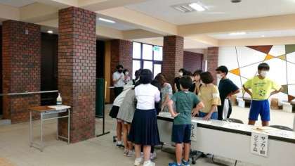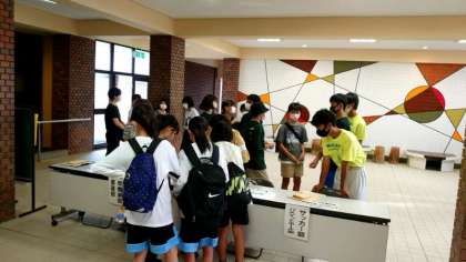 中学校の部活動体験を通して、小中の連携・交流を進める「ベアーズ」の活動が始まりました。コロナ禍のため3年ぶりの再開です。玄関ピロティに小学生が次々にやってきています。