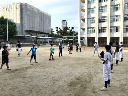 小学生が中学校の部活動を体験するベアーズの取り組み。高津中と真田山小に分かれて活動します。真田山小では野球部と女子バレーボール部が活動しました。皆さん、先輩と一緒に気持ち良い汗を流していました。