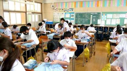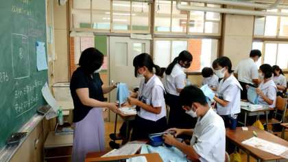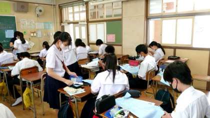 1年生家庭科実習で作成してきた刺し子刺繍。幾何学的模様が出来上がり、最後の縫い付け作業が行われています。互いに出来栄えを見せあったり、先生に縫い方を教わったり、皆さん完成にむけて頑張っています。